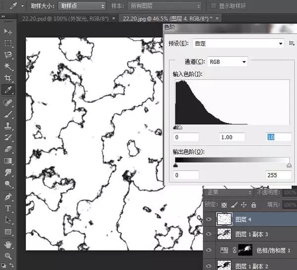 第20步:在图层1副本3上方新建一个图层4,执行滤镜>渲染>云彩命令,生成云彩效果,再执行分层云彩命令,使其产生更加丰富的变化,打开色阶对话框,将高光滑块左移,参数如图,该图层用来形成裂纹效果。