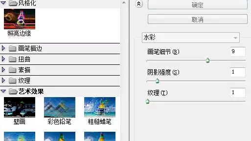 第3步:选择图层1副本,执行滤镜>艺术效果>水彩命令,设置参数如图。