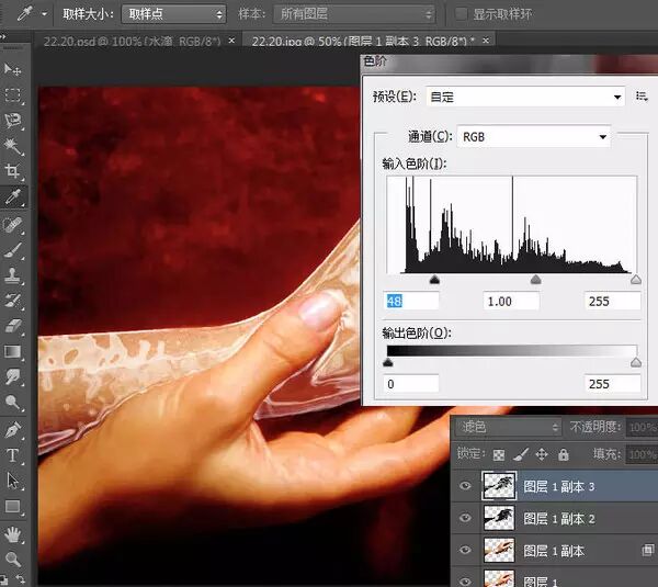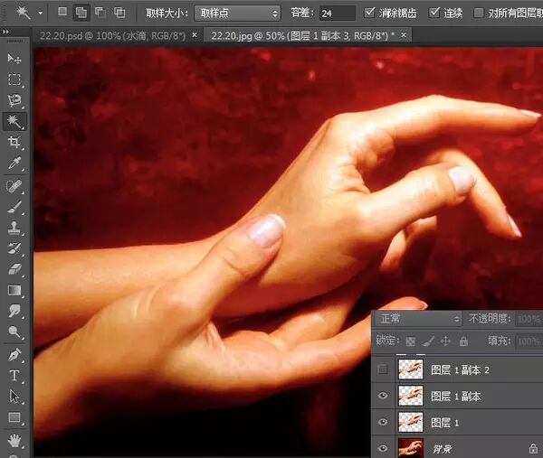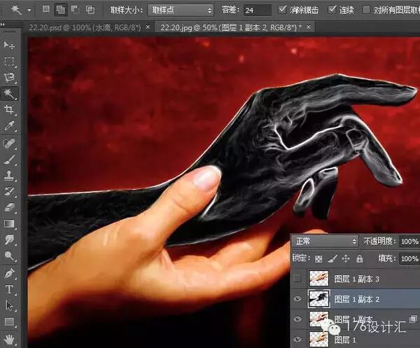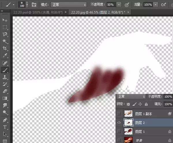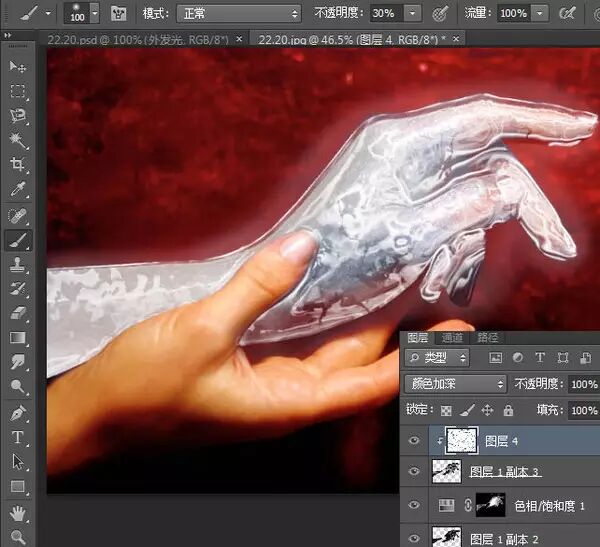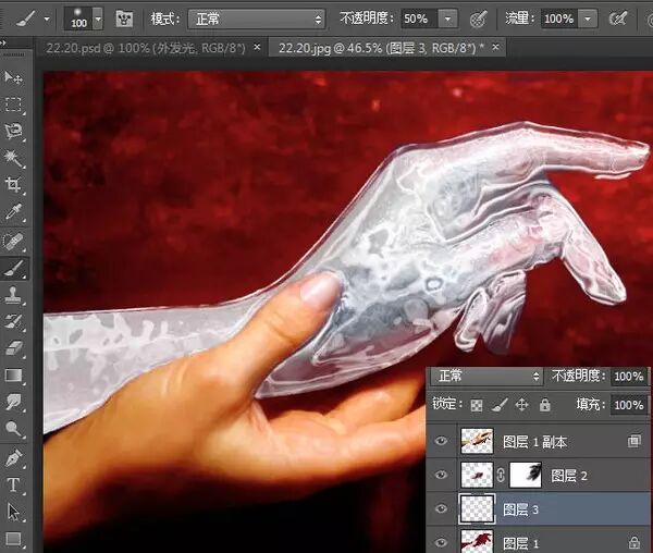 第17步:因为左手是透明冰雕,所以右手被遮挡部分也应该依稀可见,所以在图层2中用画笔绘制手指效果。