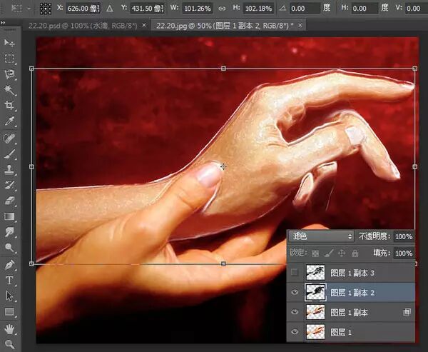 第11步:选择图层1副本2图层,Ctrl+T自由变换,将本层图像向上向左变大一点,稍微比手大一点可以看到间隙就行。