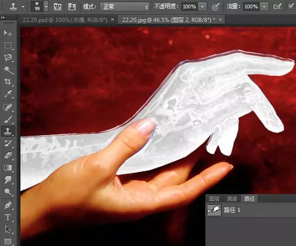 第1步:打开素材,用钢笔把要做冰冻效果的手抠出来。