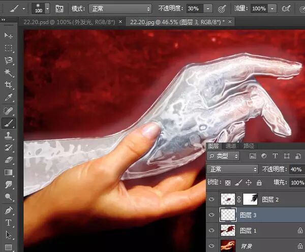 第18步:设置图层2不透明度为80%,添加蒙板,用灰色和黑色涂抹手指区域,使该部分不至于太亮。再在图层1上方新建一个图层3,设置不透明度为40%。